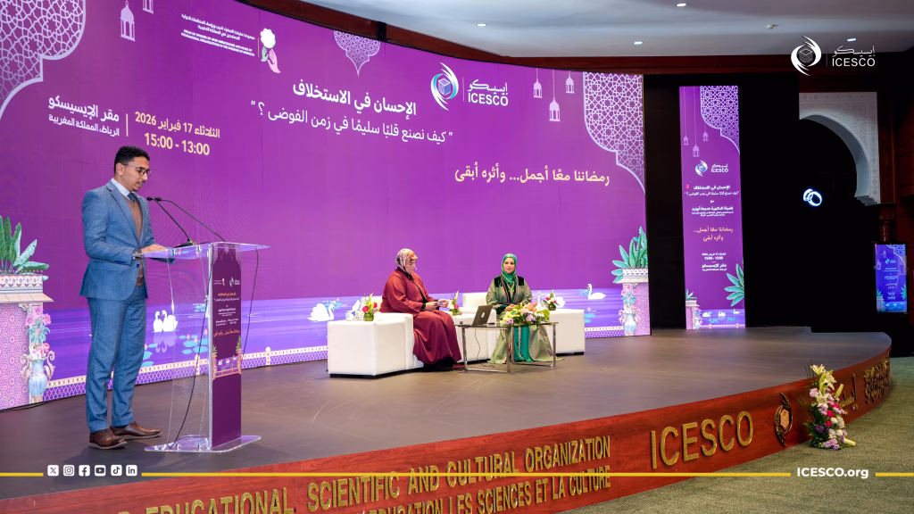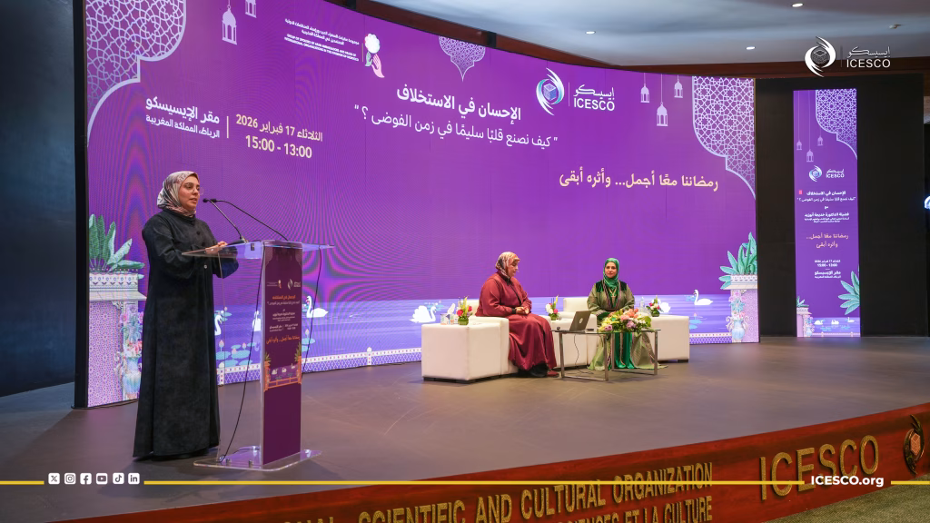 عقدت منظمة العالم الإسلامي للتربية والعلوم والثقافة (إيسيسكو)، بالتعاون مع مجموعة عقيلات السفراء العرب ورؤساء المنظمات الدولية المعتمدين لدى المملكة المغربية، لقاء علميا بعنوان “الإحسان في الاستخلاف.. كيف نصنع قلباً سليماً في زمن الفوضى؟” قدمت فيه الدكتورة خديجة أبوزيد، أستاذة التعليم العالي بكلية الآداب والعلوم الإنسانية بجامعة محمد الخامس بالرباط، محاضرة قيمة، وذلك بحضور الدكتور سالم بن محمد المالك، المدير العام للإيسيسكو، إلى جانب عدد من السفراء المعتمدين لدى المغرب وعضوات مجموعة العقيلات، ومهتمين بالشأن الفكري والروحي والتربوي.