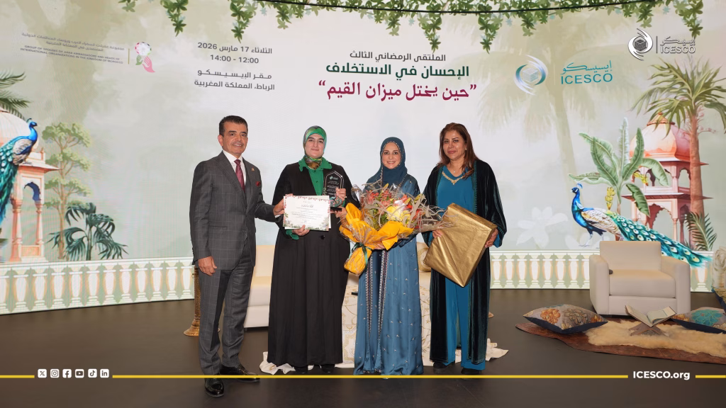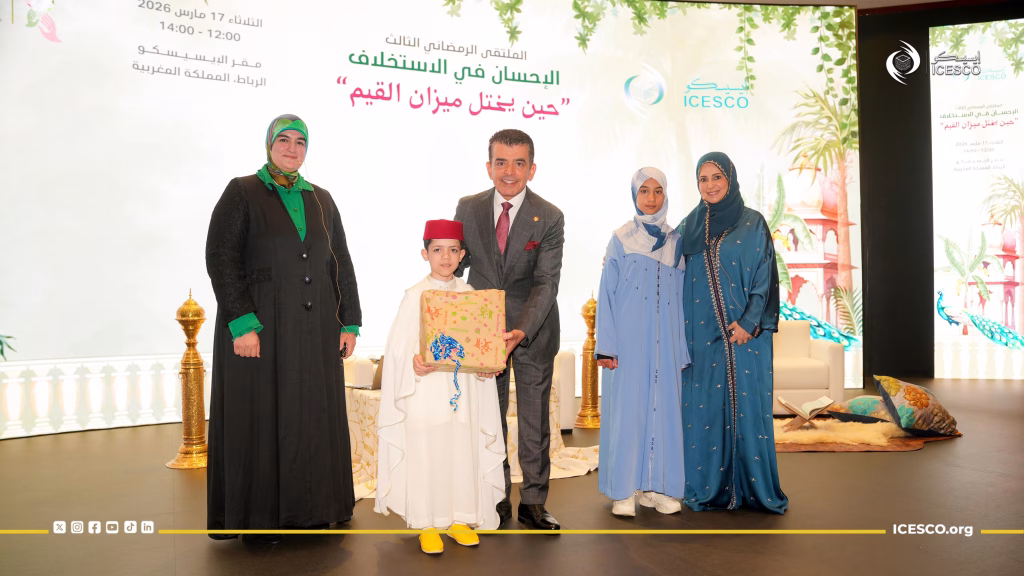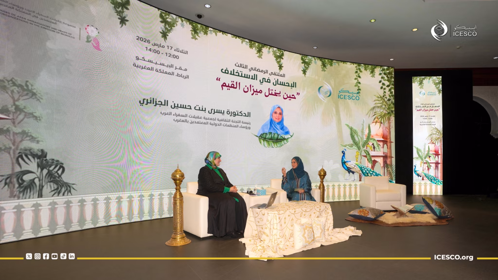 اختتمت يوم الثلاثاء 17 مارس 2026، أعمال الملتقى الرمضاني “الإحسان في الاستخلاف”، الذي عقدته منظمة العالم الإسلامي للتربية والعلوم والثقافة (إيسيسكو) بمقرها في الرباط خلال شهر رمضان المبارك بالتعاون مع مجموعة عقيلات السفراء العرب ورؤساء المنظمات الدولية المعتمدين لدى المملكة المغربية، وذلك بمحاضرة للدكتورة خديجة أبو زيد، أستاذة التعليم العالي بكلية الآداب والعلوم الإنسانية في جامعة محمد الخامس بالرباط، بعنوان: “حين يختل ميزان القيم”.