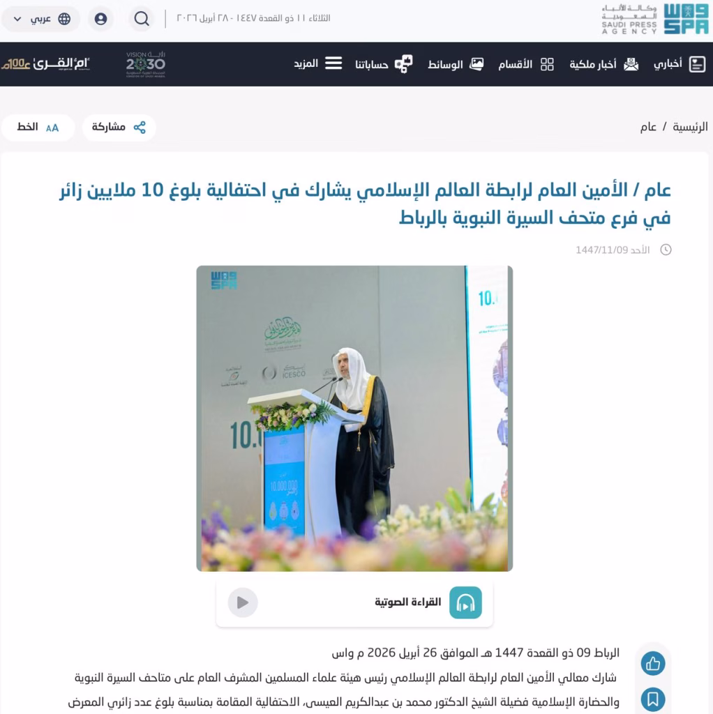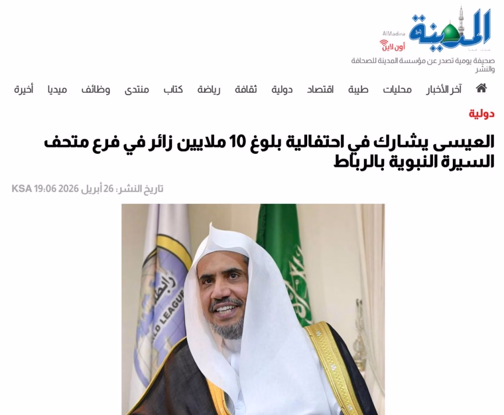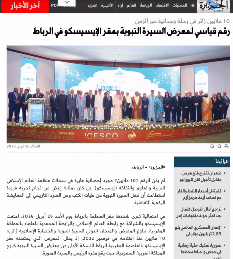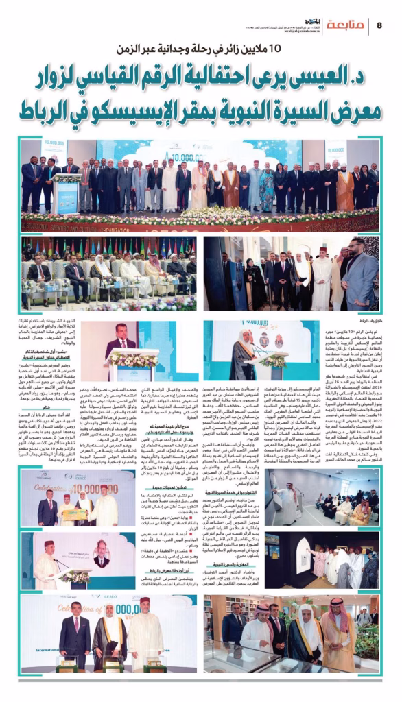 حظيت الاحتفالية التي نظمتها منظمة العالم الإسلامي للتربية والعلوم والثقافة (إيسيسكو)، بالشراكة مع رابطة العالم الإسلامي والرابطة المحمدية للعلماء بالمملكة المغربية، يوم الأحد 26 أبريل 2026، بمناسبة بلوغ عدد زوار المعرض والمتحف الدولي للسيرة النبوية والحضارة الإسلامية، بمقر الإيسيسكو في الرباط 10 ملايين زائر، بتغطية إعلامية موسعة في المملكة العربية السعودية، عكست الأهمية الرمزية والثقافية لهذا الحدث.